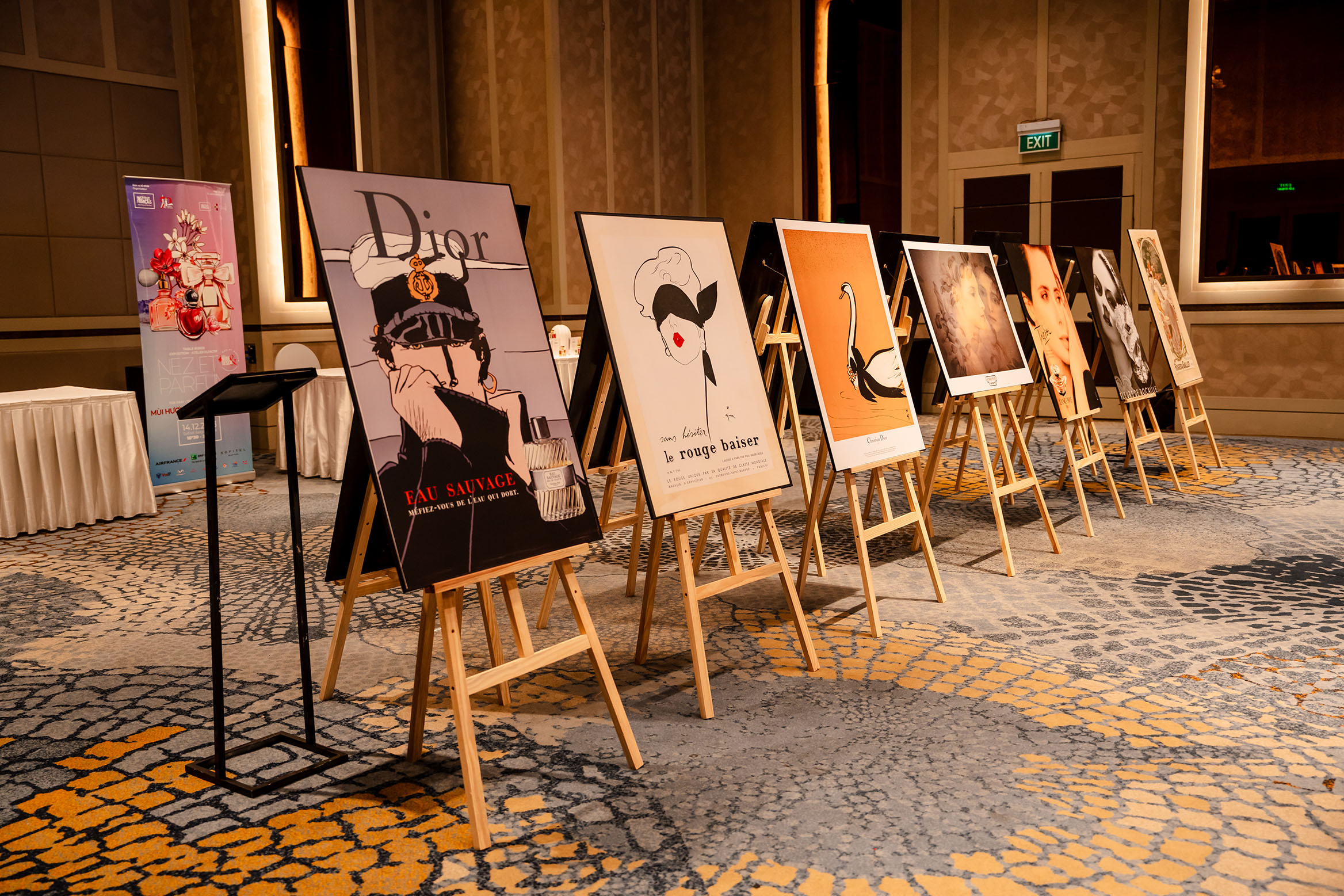 The exhibition showcased a remarkable collection of perfume advertisement posters spanning over a century, highlighting the visual evolution of the perfume industry.