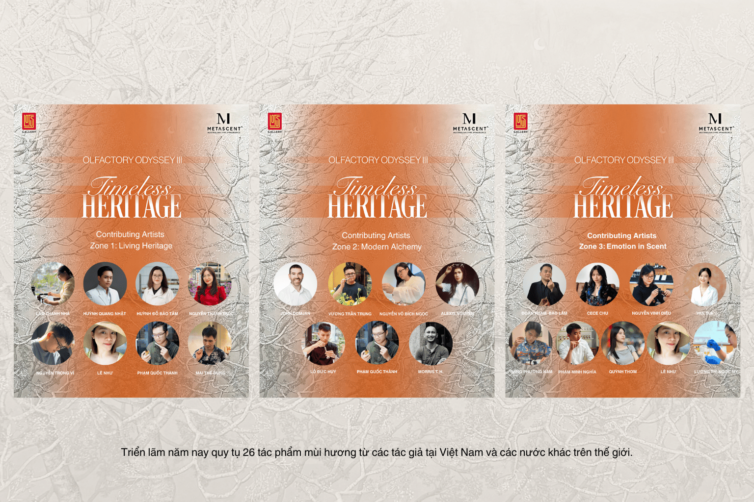 Với chủ đề Timeless Heritage, triển lãm năm nay giới thiệu 26 mùi hương nghệ thuật độc quyền do đội ngũ perfumer và các học viên của Metascent sáng tạo trong năm 2025, lấy cảm hứng từ: