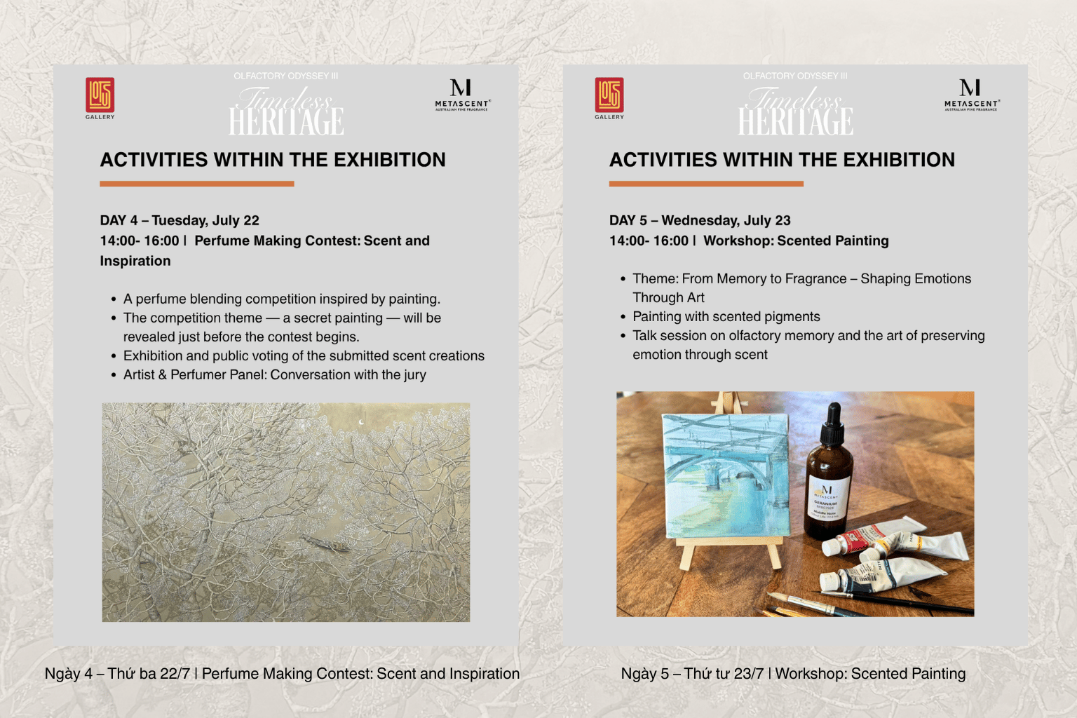 Metascent hân hạnh giới thiệu Olfactory Odyssey III: Timeless Heritage, triển lãm mùi hương và trải nghiệm đa giác quan diễn ra từ 19 đến 27 tháng 7 năm 2025 tại Lotus Gallery, Quận 7, TP. Hồ Chí Minh.