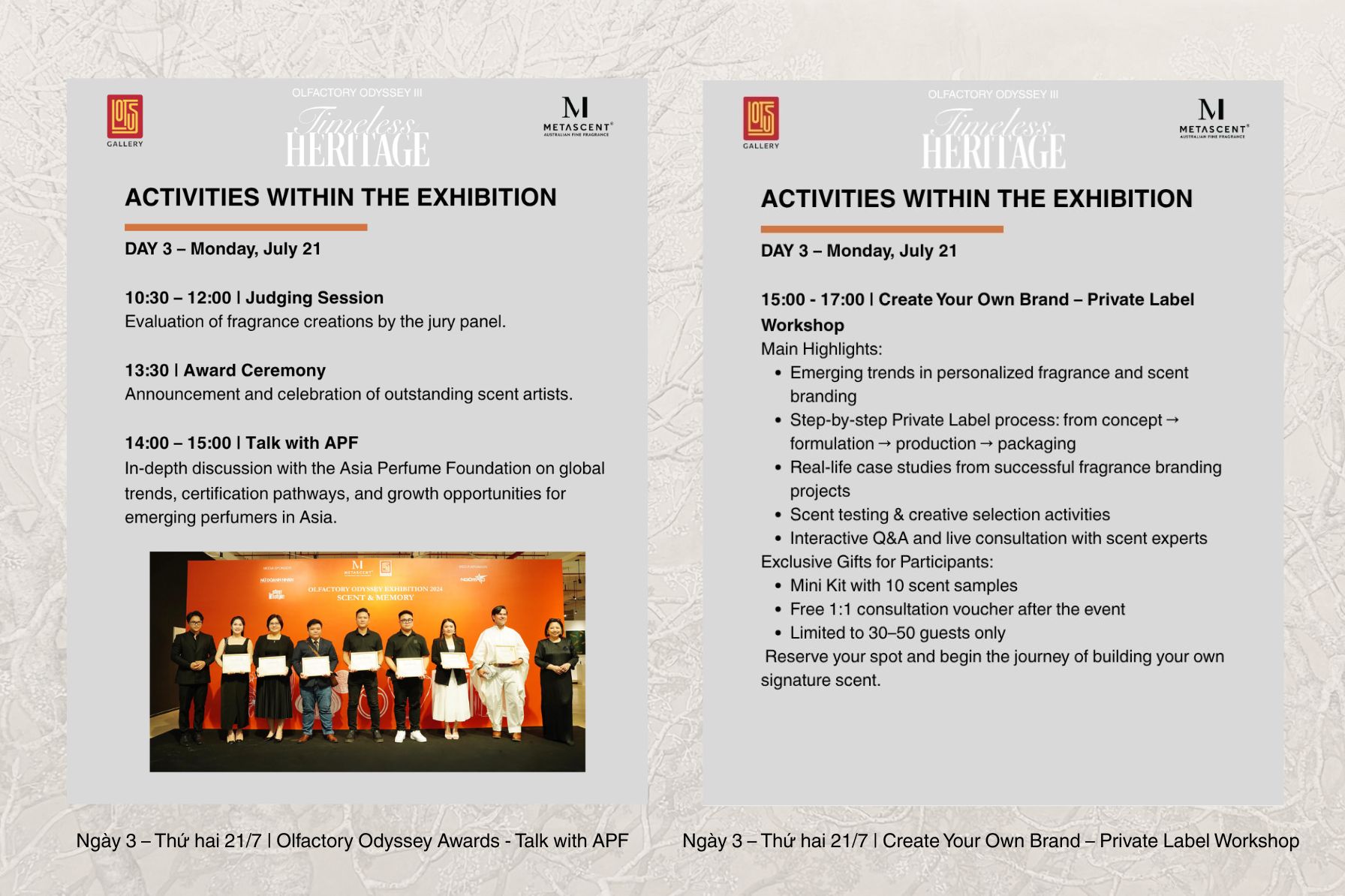 Với chuỗi trải nghiệm sống động kéo dài 9 ngày, Olfactory Odyssey III là nơi gặp gỡ giữa nghệ nhân và người yêu mùi hương, giữa quá khứ và hiện tại, giữa di sản và sáng tạo. Trong các talkshow, workshop chế tác nước hoa, hay không gian networking lounge, người tham dự có thể học cách thưởng thức mùi hương bằng trái tim và nghe kể chuyện bằng mùi hương.