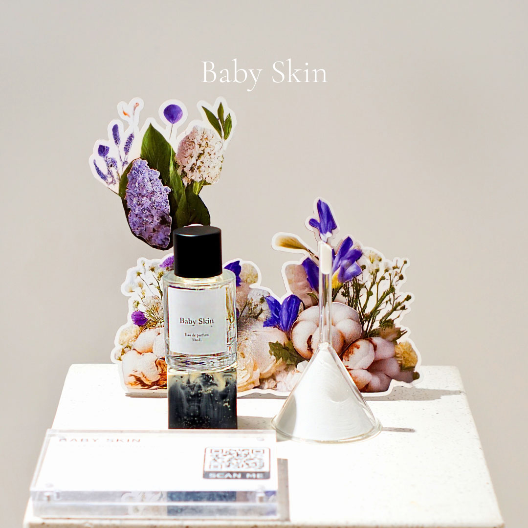Baby Skin là mùi hương của hạnh phúc và an yên. Nhắm mắt lại và hít một hơi, bạn sẽ cảm nhận được vị ngọt của Vanilla và hoa Iris, gợi nhớ đến hương sữa thoang thoảng trên làn da em bé. Xen kẽ là hương thơm thanh mát của Ozone, mô phỏng bầu không khí trong lành, mang đến cảm giác sảng khoái, thư giãn, xua tan mọi muộn phiền. Tiếp đến là note hương tinh tế của Galaxolide, như ánh nắng sớm mai, tượng trưng cho sự khởi đầu mới và những hy vọng tươi sáng. Cuối cùng, dư vị ấm áp của gỗ đàn hương lưu luyến trên da, mang đến cảm giác bình yên.