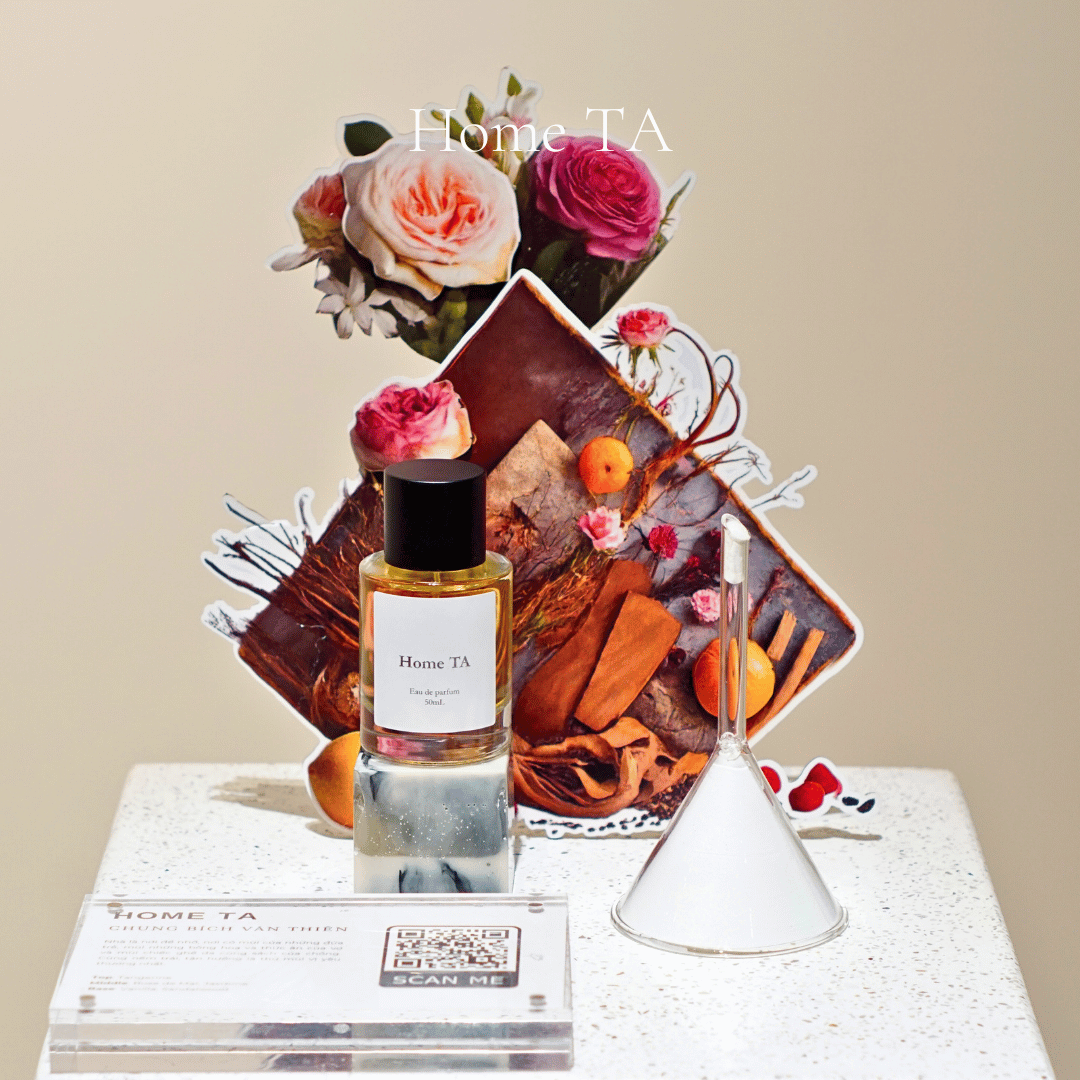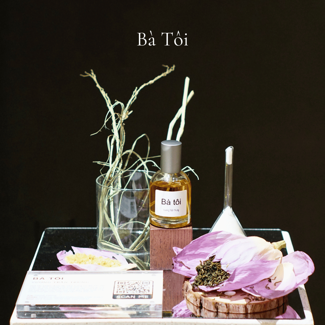 Đây là một tác phẩm được lấy cảm hứng từ " Bà Tôi ". Mùi hương chủ đạo sẽ là hương lá nếp của bát chè bà hay nấu, mùi than củi của gian bếp cuối nhà cùng mùi gỗ mộc mạc của căn nhà xưa cũ. Tôi muốn tái hiện lại mùi hương của tuổi thơ, mùi hương của thôn quê. Tầng hương đầu sẽ lã những note hương của Ozone, Calone cùng mùi hương của Lá Nếp. Nếu bạn ở Sài Gòn thì chắc không xa lạ với mùi hương này được các bác tài sử dụng rất nhiều và đây cũng là mùi hương tôi cảm nhận được khi đặt chân tới SG lần đầu tiên năm 2020. Và lúc đó, tôi đã nghĩ ngay về người bà của mình. Tiếp theo đó, sẽ là sự xuất hiện của Than Củi. Mùi hương khói nhẹ nhàng. Có một số bạn nói với tôi, nó giống với thịt trâu gác bếp. Tôi nghĩ bụng, thế lại càng tốt. Vì đó là hình ảnh món ăn đặc trưng của người dân vùng cao, càng thấy nhung nhớ quê hương. Ở tầng hương giữa, tôi lựa chọn những note hương hoa cỏ nhẹ nhàng như Hedione, Roman Chamomile và Clear Green, Mate để vẽ ra cánh đồng quê rộng lớn với những bãi cỏ xanh êm. Một cảm giác yên bình, dễ chịu và chỉ có ở nơi đó bạn mới có thể cảm nhận được. Phía cuối tác phẩm là những note hương gỗ mộc mạc như Iso E Super, White Oak, Cashmeran để vẽ ra căn nhà gỗ mộc mạc xưa cũ của bà. Tất cả hoà quyện lại, làm tôi nhớ lại khung cảnh căn nhà xưa cũ đó cùng những trận đòn roi tới giờ vẫn thấy đau khi nhớ lại.