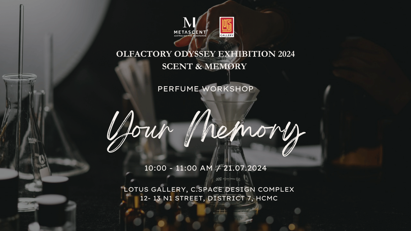 Workshop "Your Memory" sẽ giúp bạn khám phá những ký ức và cảm xúc qua mùi hương. Dưới sự hướng dẫn của các chuyên gia từ MetaScent, bạn sẽ học cách điều chế nước hoa dựa trên những kỷ niệm cá nhân, từ đó tạo ra một mùi hương đặc biệt mang đậm dấu ấn của riêng mình.